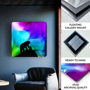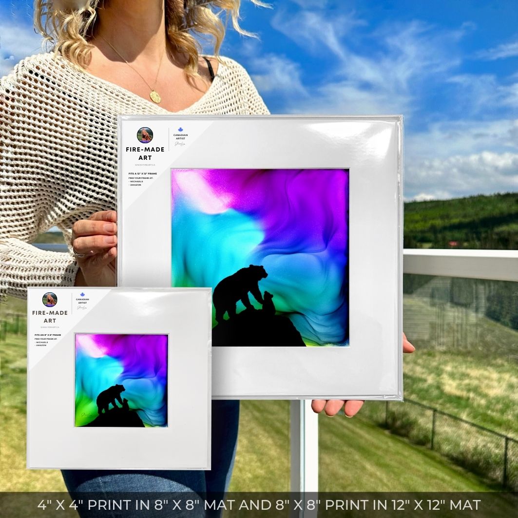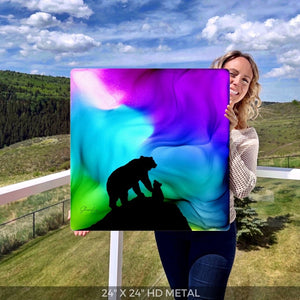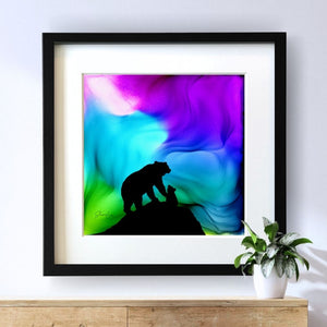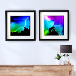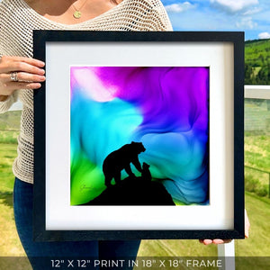The fire and ink created this aurora-filled sky, where a bear cub and its mother take in the wonder of the night. There is a hunger in all of us to explore- and following that curiosity leads us to beautiful and wild places.