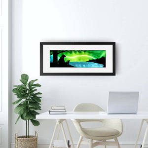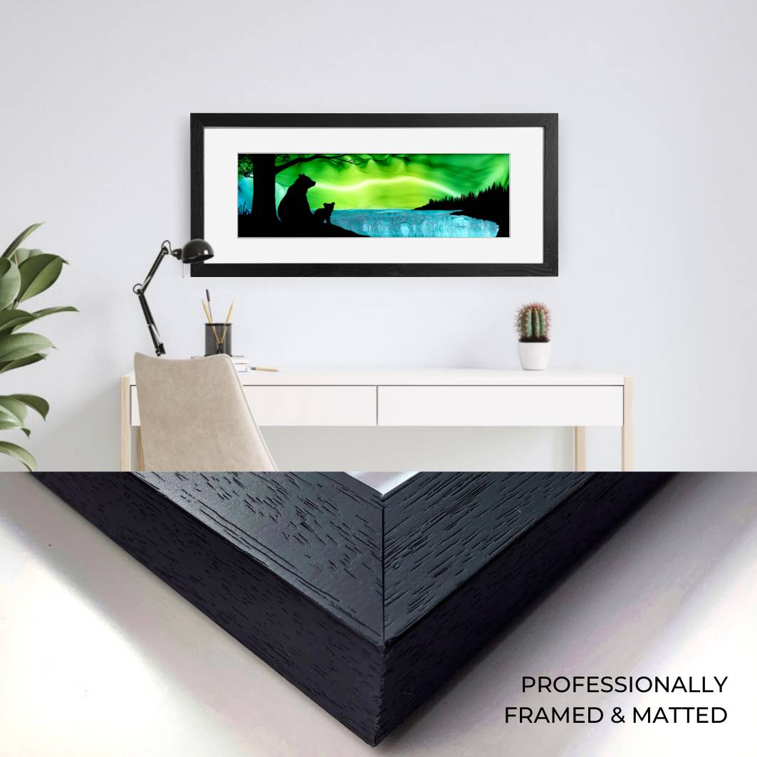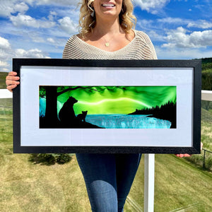 A mother bear and her cub sit quietly at the water’s edge, surrounded by the untamed beauty of the wild. This piece was born in a moment of wild collaboration—fire, ink, and a sudden gust of wind came together to shape the aurora-like sky and intricate frozen textures of the lake. It’s a portrait of stillness within movement, a reminder that even in the rawness of nature, peace can be found.