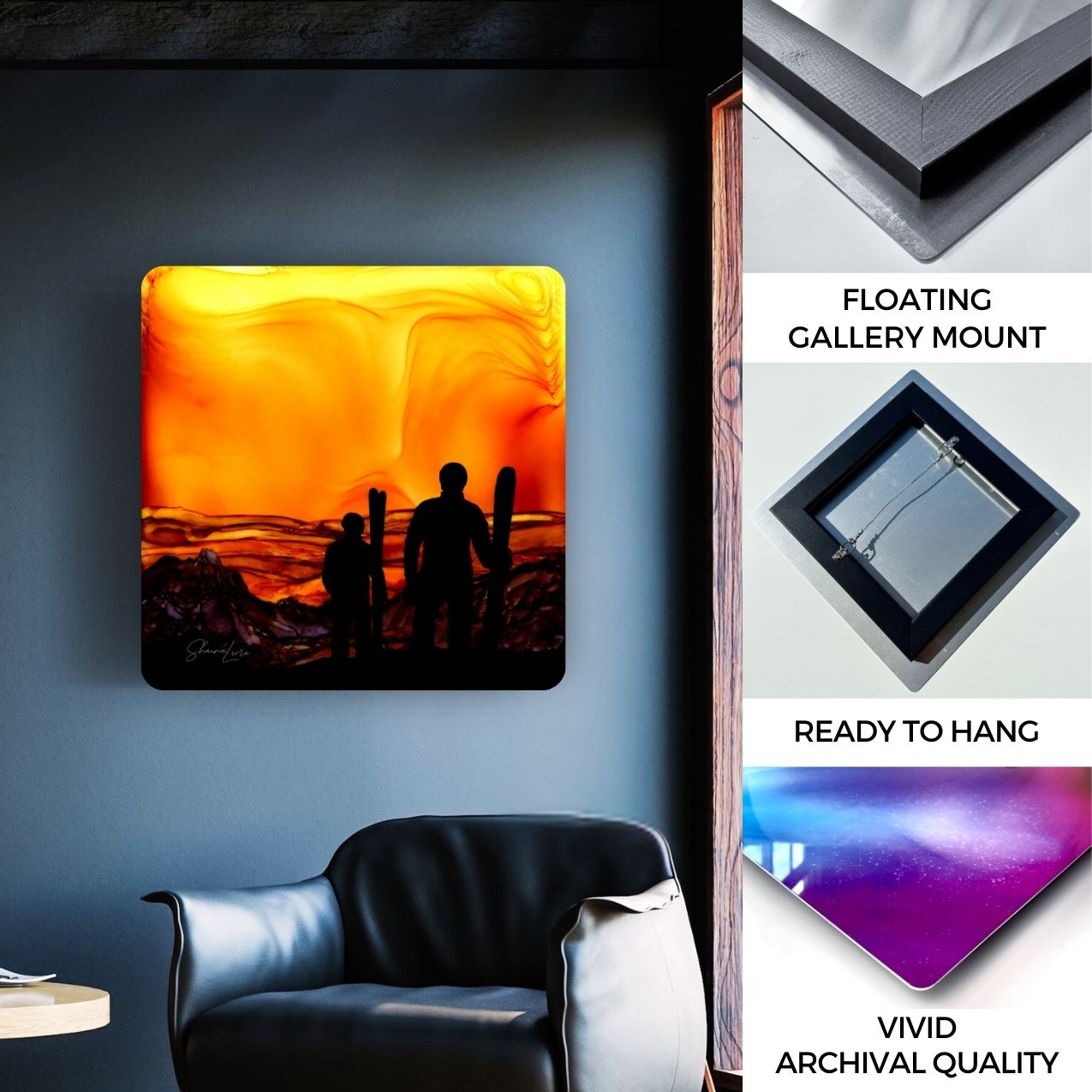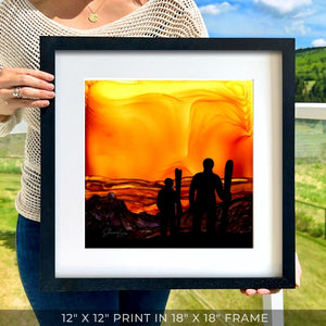 The warm glow of a rising sun is created through the ink burning process, embodying a fresh start filled with adventure and the unexpected. I love early mornings in the backcountry when the air is fresh and I'm filled with the anticipation of skiing through fresh powder.